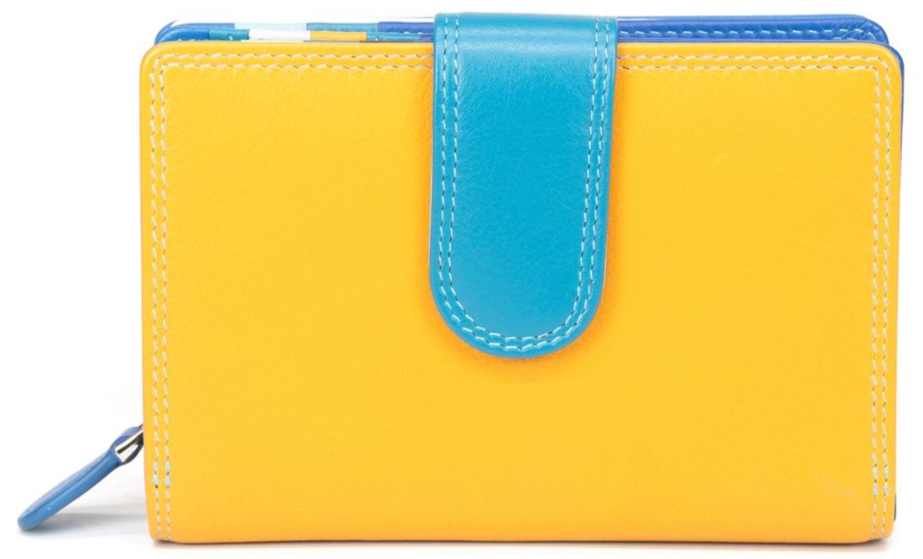 This lovely fun colourful purse is perfect for anyone who always has a full purse! It has 9 card slots with 6 slip pockets behind the card columns, 2 spaces for notes, a photo window and a zip around coin section with a divider. It has a tab closure for cards with a double popper incase you have one to many!