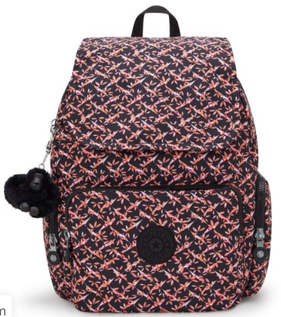 ,A strong but lightweight backpack. The main compartment has a zip closure & magnetic flap, inside there is an open pocket and a side zipped pocket & 2 pen loops. Outside is one open and one zipped outside front pocket plus two outside side zip pockets. The straps are adjustable & there is the Kipling furry monkey.