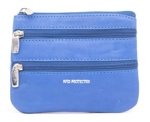 Crafted from smooth grained leather, this coin purse has 3 zip pockets, great for coins, notes as well as cards. This purse is also protected with RFID which helps prevent your cards from identity theft.