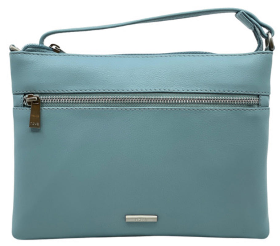 Soft leather cross body bag with adjustable shoulder strap. It has a main zip compartment with an inside zip pocket and 2 slip pockets. It also has a zip on the back and a zip pocket on the front.