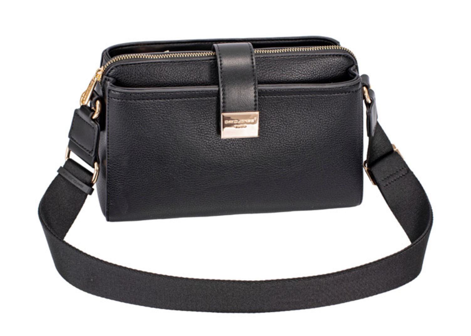 This practical everyday bag has three top zip pockets with a security strap over which fastens with a magnetic stud. Inside the main middle zip is a zip and slip pocket. The webbing shoulder strap is adjustable.