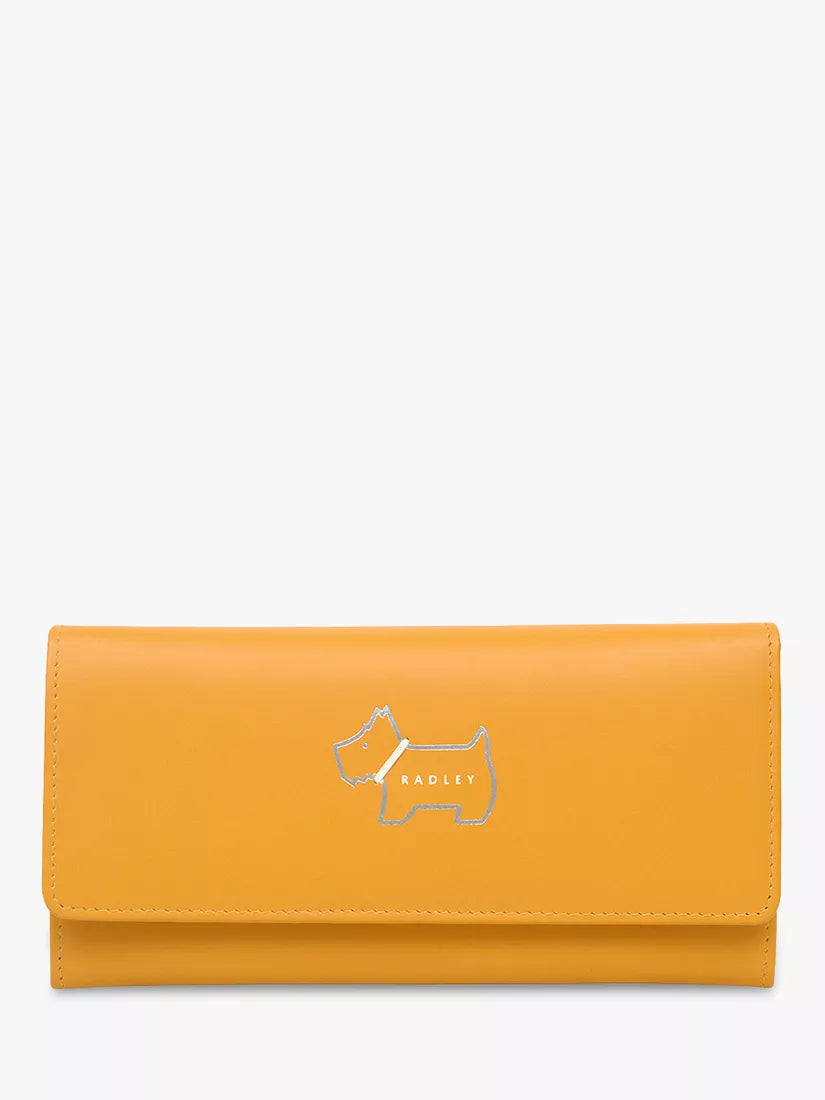 This purse is perfect for holding all your everyday essentials. The purse is made from smooth cobalt leather and featured on the front is the Radley dog embossed in gold with a small black collar appliquéd around its neck. The Radley brand name has been embossed on the front and the back in gold. The purse has a flap over closure with a popper to hold it shut and inside is lined with black polka dot smooth leather. There are 12 card slots, 2 zipped pockets for all your loose coins and 3 slip pockets for receipts and banknotes; there is also an ID window. There is another zipped pocket on the back which is more accessible for loose coins.