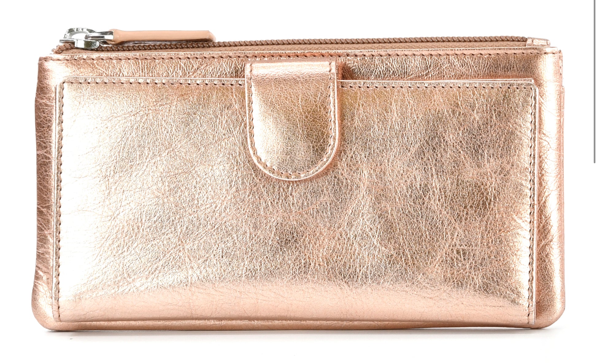 Purse with tab closure featuring 10 card slots, photo window, 2 hidden slip pockets and a separate zip pocket for coins.