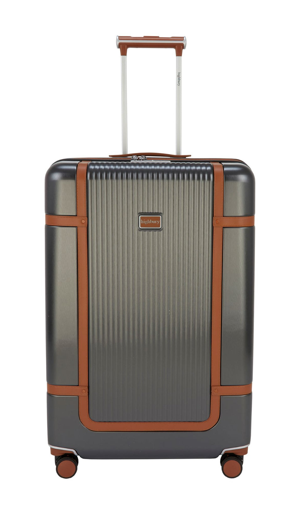 Stylish lightweight moulded case with tan contrast trim. This has 4 double wheels for easy 360 degree manoeuvres. There is a handle on the back and side and a telescopic handle. There is a built in TSA combination lock.