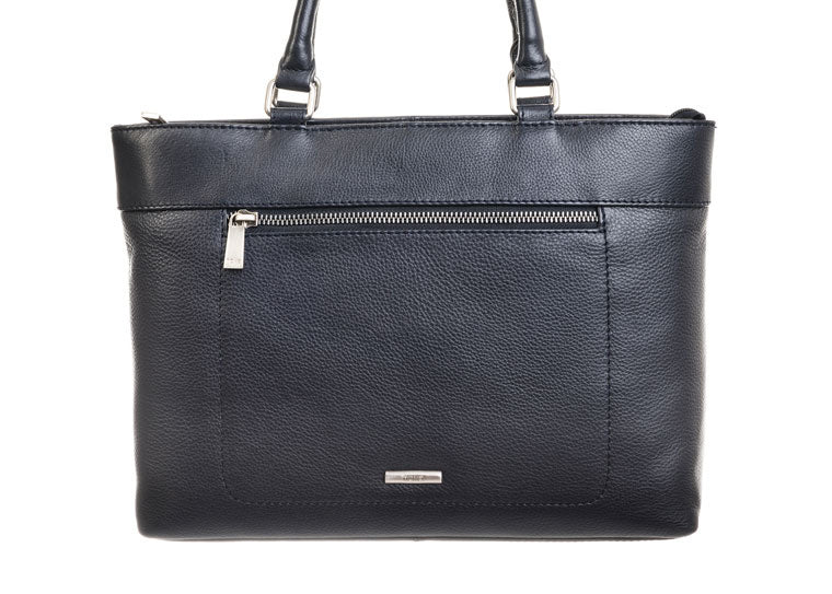 This lovely leather bag has a top zip with an inside zip and 2 slip pockets. There is a front zip and a back zip pocket. It has double grab straps with a detachable adjustable shoulder strap.
