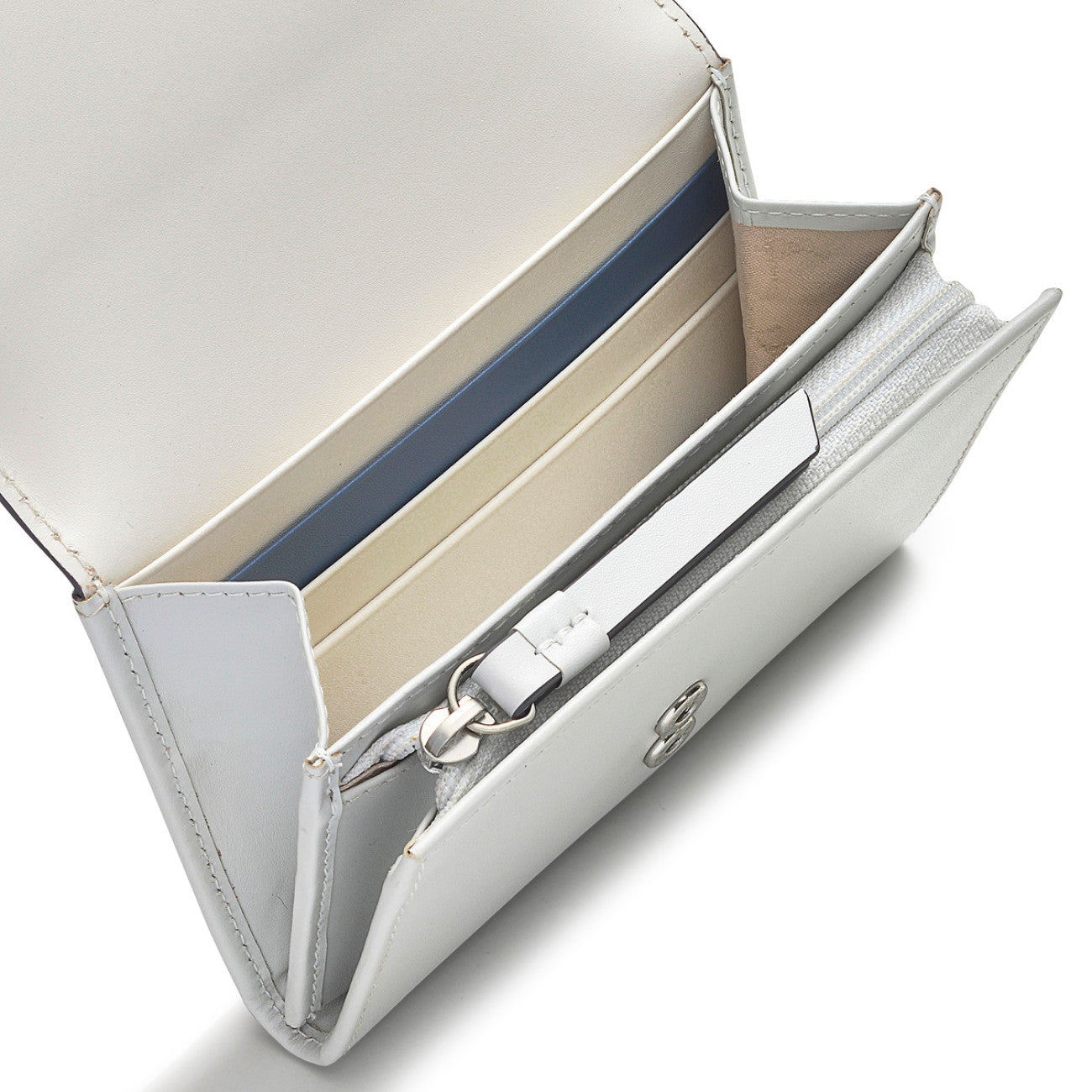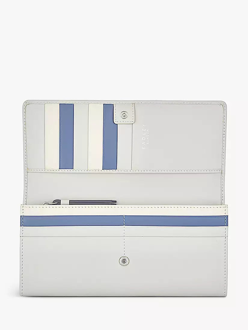 This purse has Radley on the front in three different yoga poses! There is a back zip pocket and under the flap there is a centre zip compartment with a pocket on either side. There is a slip pocket for notes and 19 card slots.