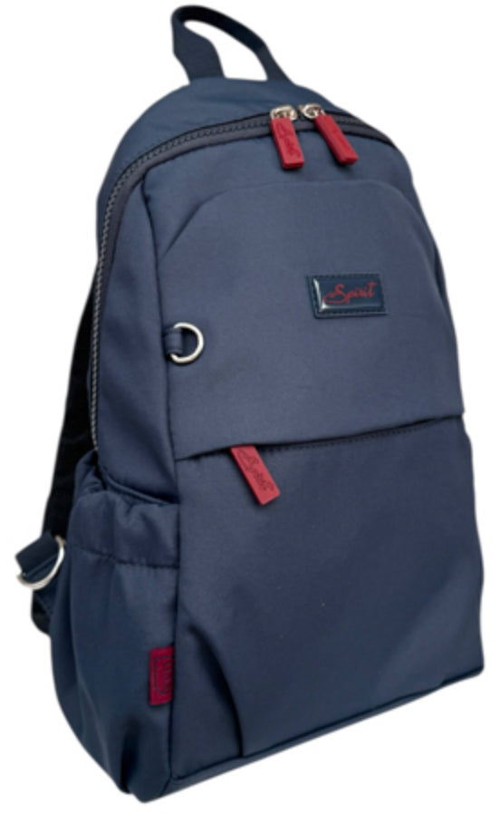 A lightweight crossbody backpack with an adjustable, detachable shoulder strap which affixes to either side. It has a zip top and a zip front pocket and another smaller pocket with a magnetic dot. There is a zip back pocket too and two side pockets. Internally, there is a zip pocket and an open pocket.