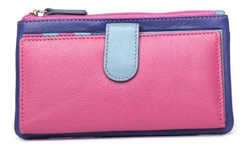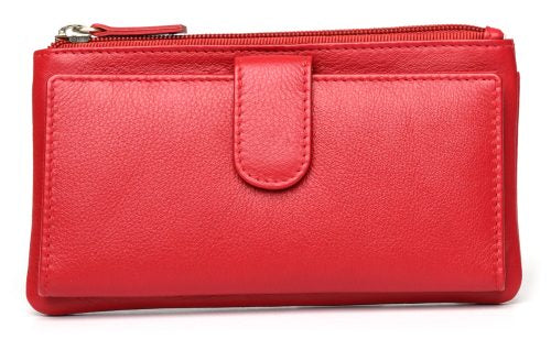 This soft purse has an outside zip compartment for coins and inside the wallet there are 10 card slots, a photo/ID window and a slot for notes. There is also a slip pocket on the back. It is RFID protected.