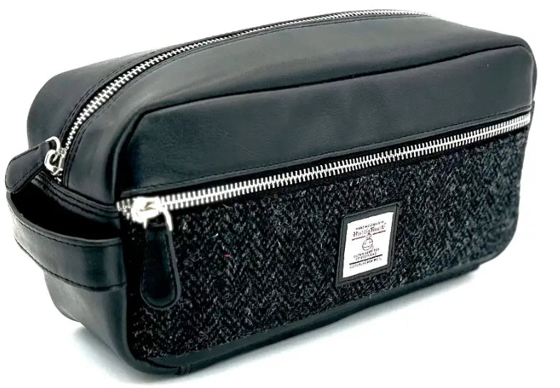 Harris Tweed Wash Bag with outside zip compartment, zip top and side grab handle.